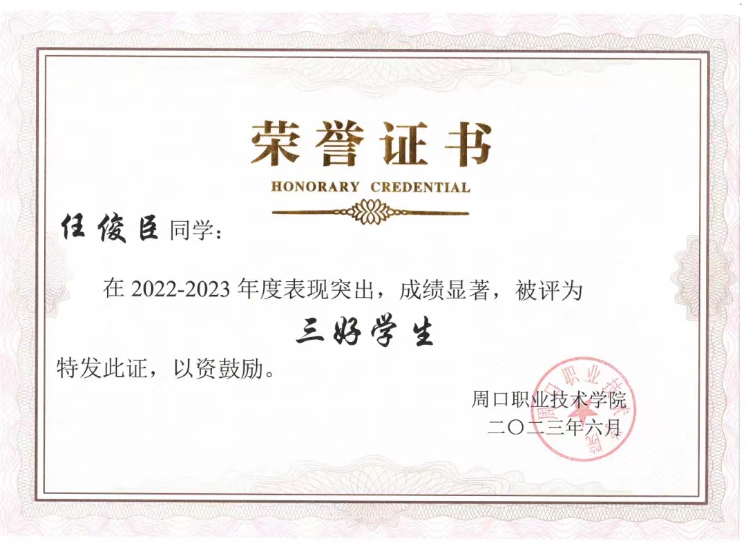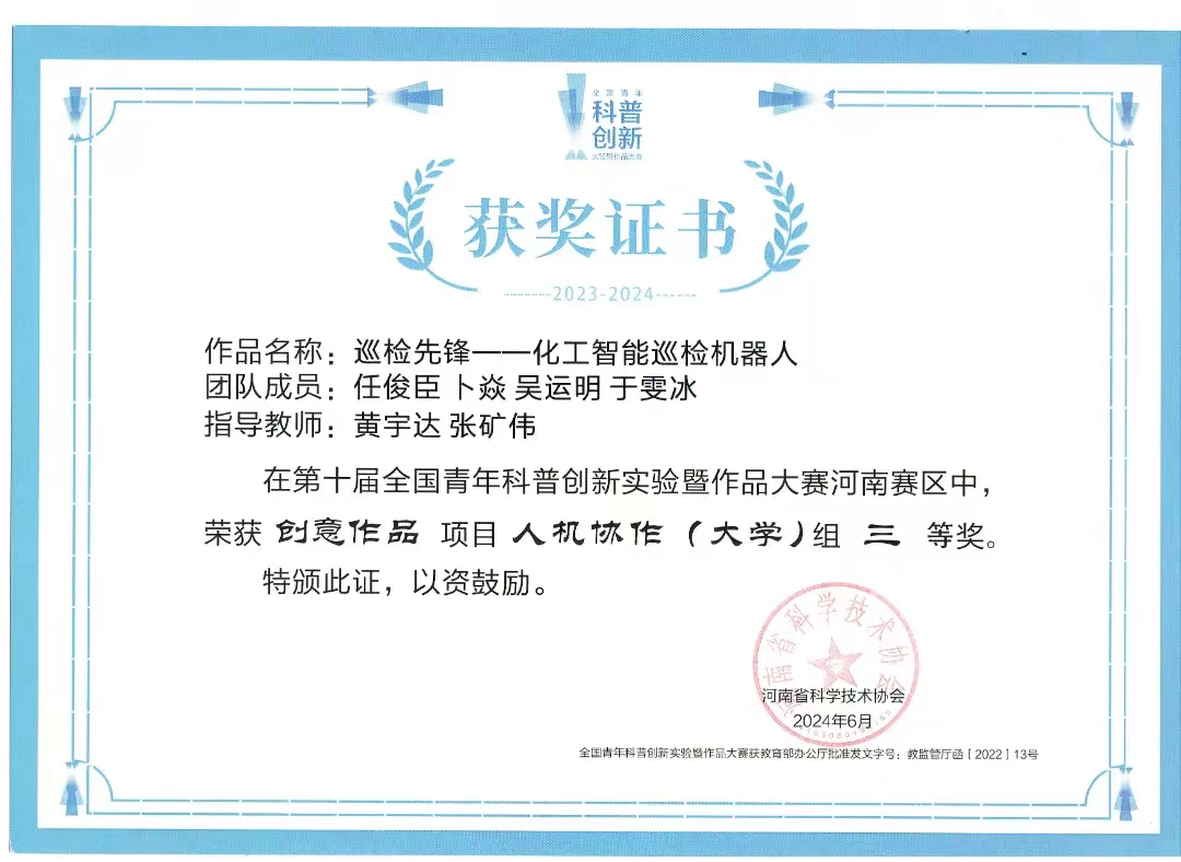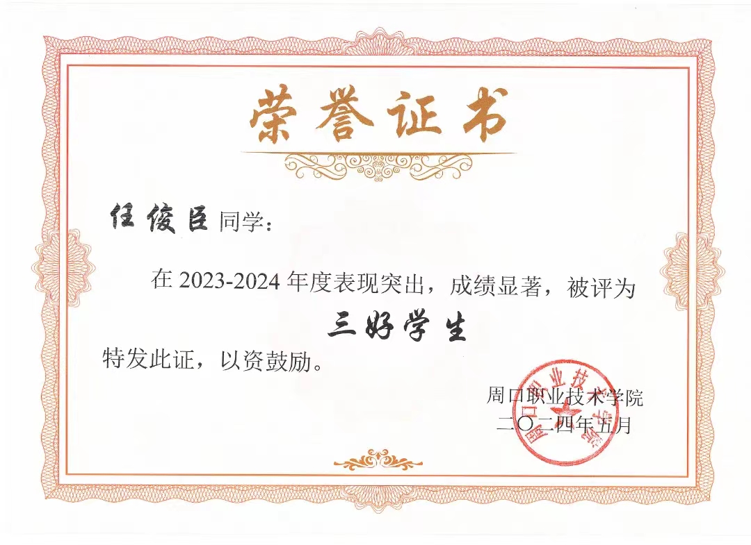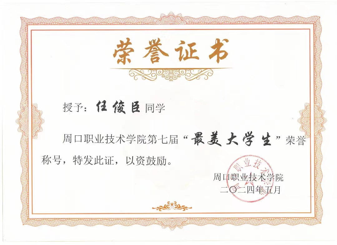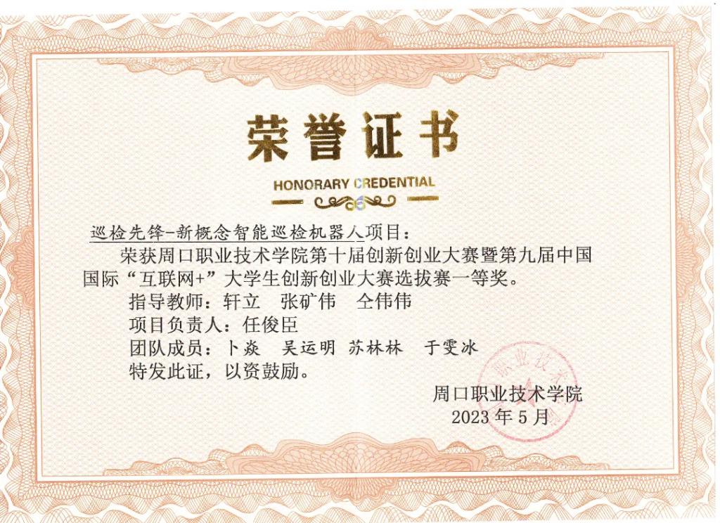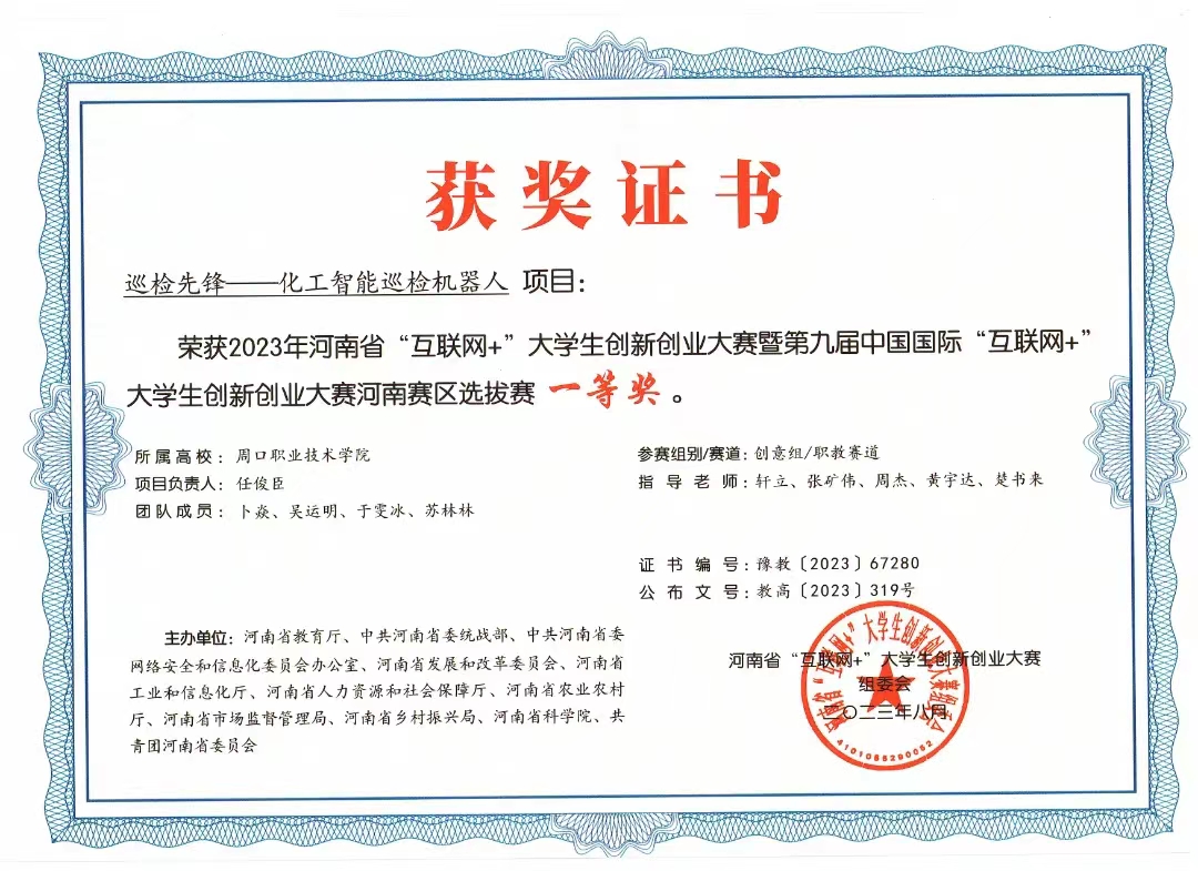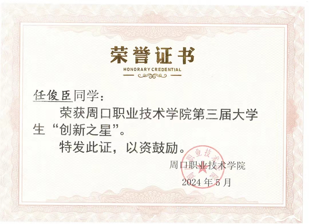 奉献自该生,率先垂范 于时代的旋律中聆听,创新是奏响辉煌乐章的最强音;于时代的浪潮中探寻,创业是激起澎湃浪花的无穷力量。作为一名新时代的有为青年,该生深知创新是发展的核心动力,唯有创新方能引领未来。青年兴则国家兴,当代青年应当深入挖掘自身的创新意识与创新能力,勇当国家未来发展的中流砥柱。在 2023 年,该生踊跃报名参加yl23411永利(集团)有限公司官网第十届互联网+大学生创新创业大赛,在团队的齐心协力下,成功斩获第十届互联网+大学生创新创业大赛校赛一等奖,随后被学校推选至“互联网+”省赛,在留校培训期间,该生带领AI智慧未来创新团队日夜拼搏,努力完善每一处细节问题,并成功取得河南省互联网+大学生创新创业大赛一等奖。然而,该生并未止步于此,一个成功的项目是需要经过千锤百炼才得以问世的,该生深知前方依旧是路漫漫其修远兮,路途总是充满荆棘和坎坷,但要有虽千万人,吾往矣的勇气去面对挑战,坚定地朝着目标前进!接着,该生带领团队报名参加了第十八届“挑战杯”全国大学生课外学术科技作品竞赛“黑科技”展示活动,翻阅了三百多篇的文献资料,实地调研考察数十余次,经过上百次版本的更迭,最终《新概念智能化工巡检机器人》项目凭借着优异的成绩取得国赛一等奖的佳绩,据报道显示,此次河南省仅有一所专科院校取得此项殊荣。之后,在振兴杯省赛现场,该生的团队以全省前三名的优异成绩被推荐至振兴杯国赛现场,胜利的曙光已在眼前,一切都在悄然等待,紧张的氛围在空气中弥漫,最后的结果恰似那即将敲响的钟声,蓄势待发,在全国各大高职院校齐聚的舞台上,该生经过激烈的角逐,通过对评委的问题进行详尽的回答,自信、大方的展示项目,最终凭借着优异的成绩荣获国赛金奖。长路漫漫,他将上下而求索,未来的路还很长,该生将胸怀大志,奋勇前行!经过三年的学习与磨砺,全面提升了自身的综合能力,在工作中也学到了许多书本和课堂上学不到的宝贵经验。同时,该生养成了诚实守信、守时守约、做事讲原则、敢于承担责任的良好习惯,无论是为人处世还是交流表达,都有了显著进步。三年来,该生始终坚守“奉献无止境,追求不停歇”的人生格言。该生认真负责的工作态度和乐于奉献的精神,赢得了师生们的一致赞誉,并连续两年获得“三好学生”荣誉称号。