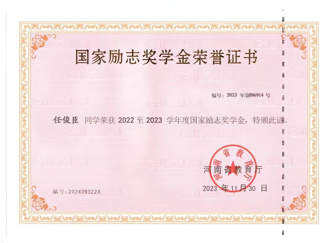 任俊臣,男,汉族,出生于2003年12月18日,预备党员,2022年9月入学,就读yl23411永利(集团)有限公司官网,信息工程学院计算机网络技术02班。曾获荣誉:第三届河南省大学生“创新之星”、2023国家励志奖学金、第七届普通高等学校“出彩中原”大学生社会实践活动项目获省级立项、河南第九届互联网+大学生创新创业大赛省赛一等奖、第十八届“振兴杯”全国青年职业技能大赛创新创效竞赛省赛金等奖、第十八届“振兴杯”全国青年职业技能大赛创新创效竞赛国赛金奖、第十八届“挑战杯”全国大学生课外学术科技作品竞赛“黑科技”展示活动恒星级作品(等同于全国一等奖)、第十八届全国高职院校“发明杯”大学生专利创新大赛国赛二等奖、第十届全国青年科普创新实验暨作品大赛三等奖等。