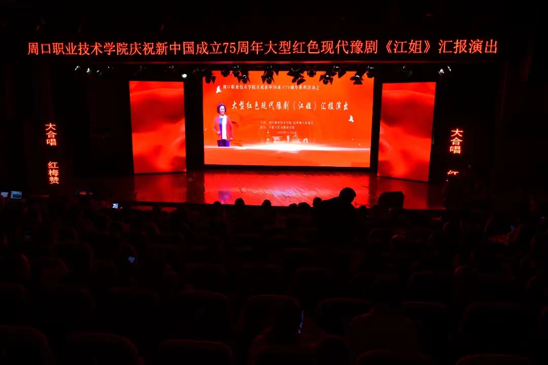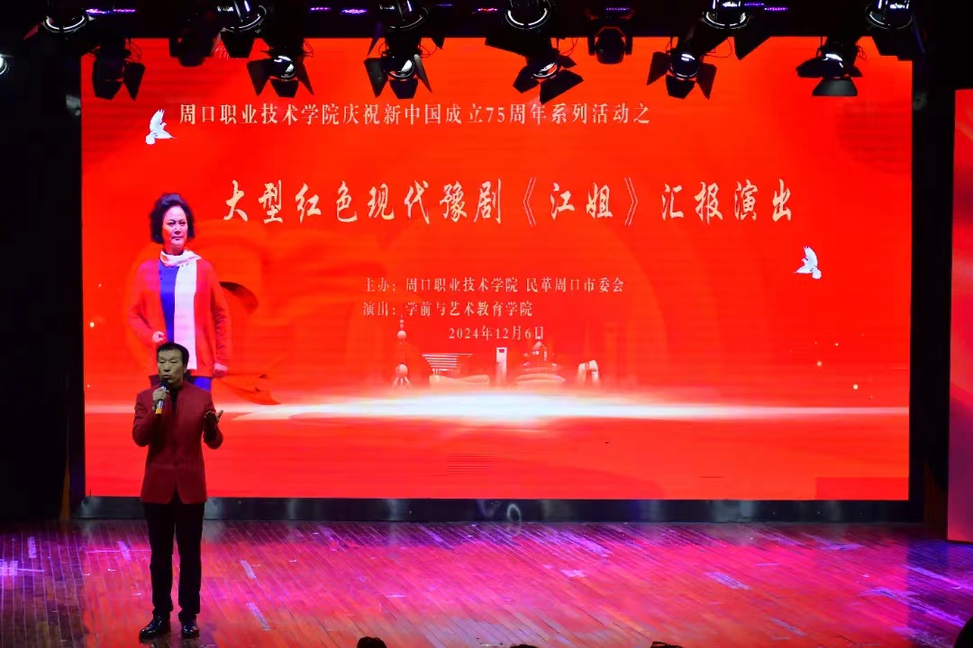 为了进一步增强同学们的爱国情怀,巩固同学们的爱国意识。yl23411永利(集团)有限公司官网、民革周口市委会主办的庆祝新中国成立七十五周年系列活动之大型红色现代豫剧《江姐》汇报演出于12月6日下午在开元校区砺德厅举办。校长李清臣,校领导李明臣、郭汝礼、王隼、于爱霞、李向东,已退休老干部代表,校属各部门副科级以上干部及师生代表近千人共同观演。