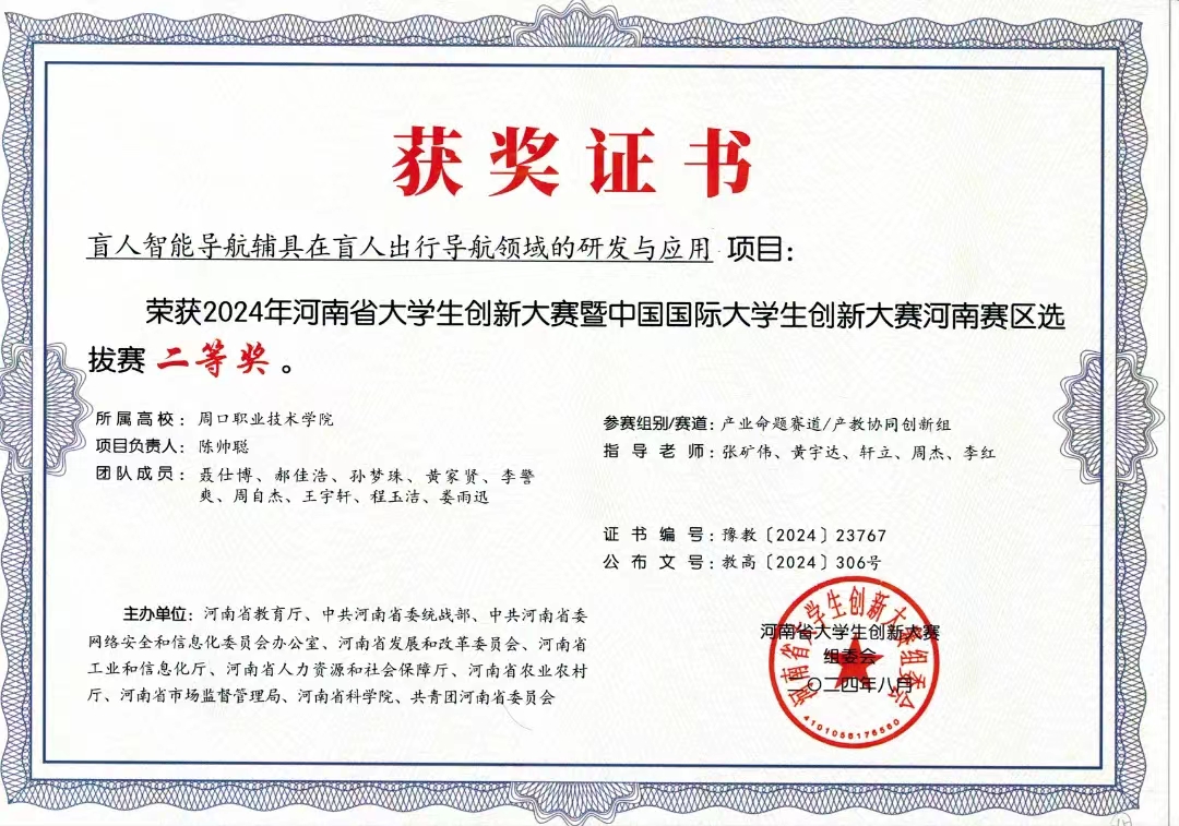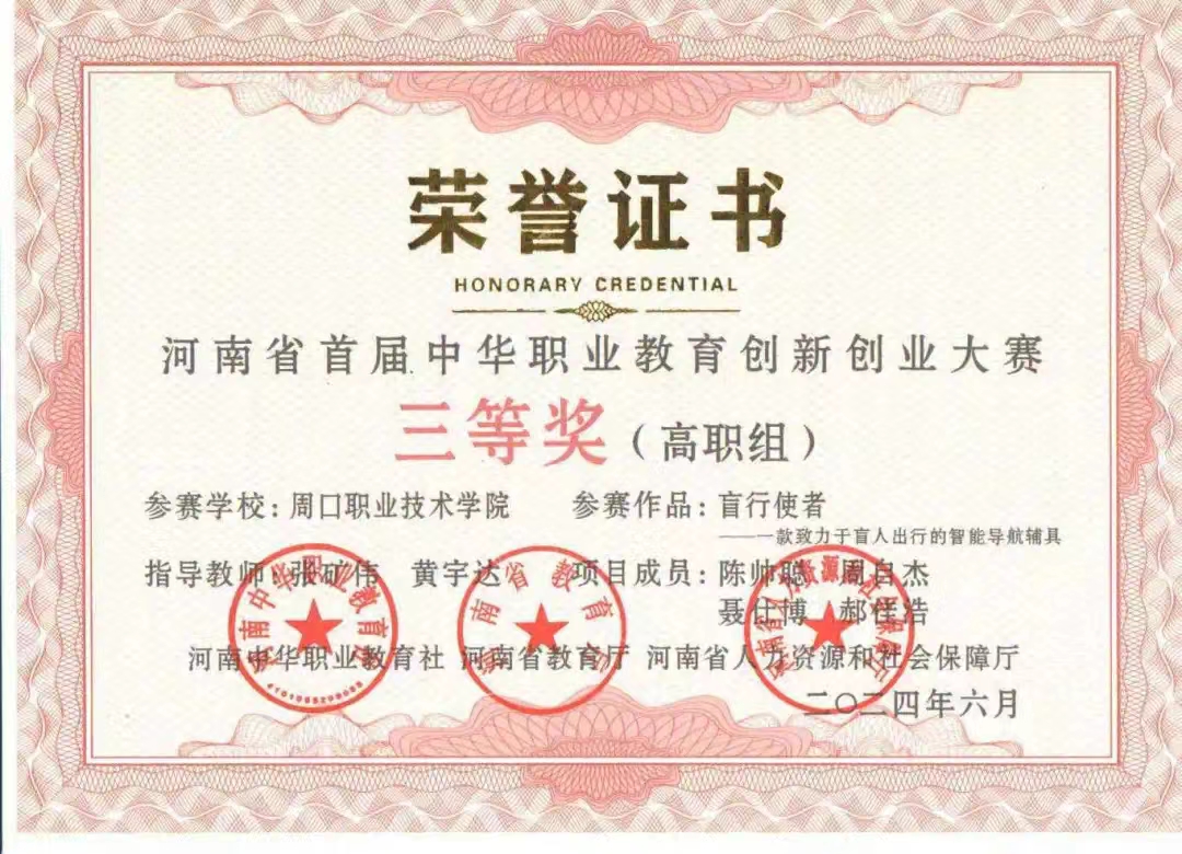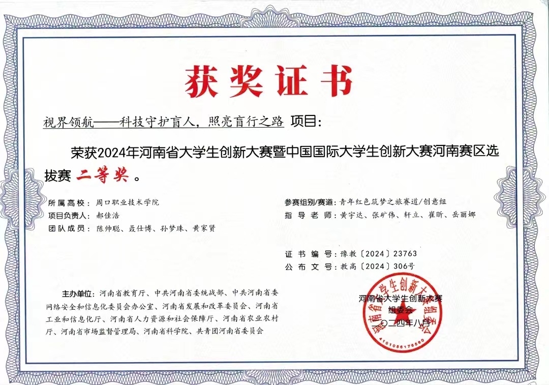 在竞赛方面,我作为团队负责人,带领团队参加了创客中国、挑战杯、中国国际大学生创新创业大赛和中华职教赛等多项国家重点赛项。获得了“挑战杯”河南省大学生创业竞赛金奖两项,中国国际大学生创新创业大赛(2024)河南省省赛二等奖三项,以及中华职教赛省赛三等奖等多项荣誉。