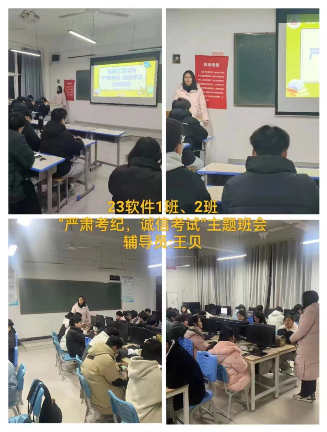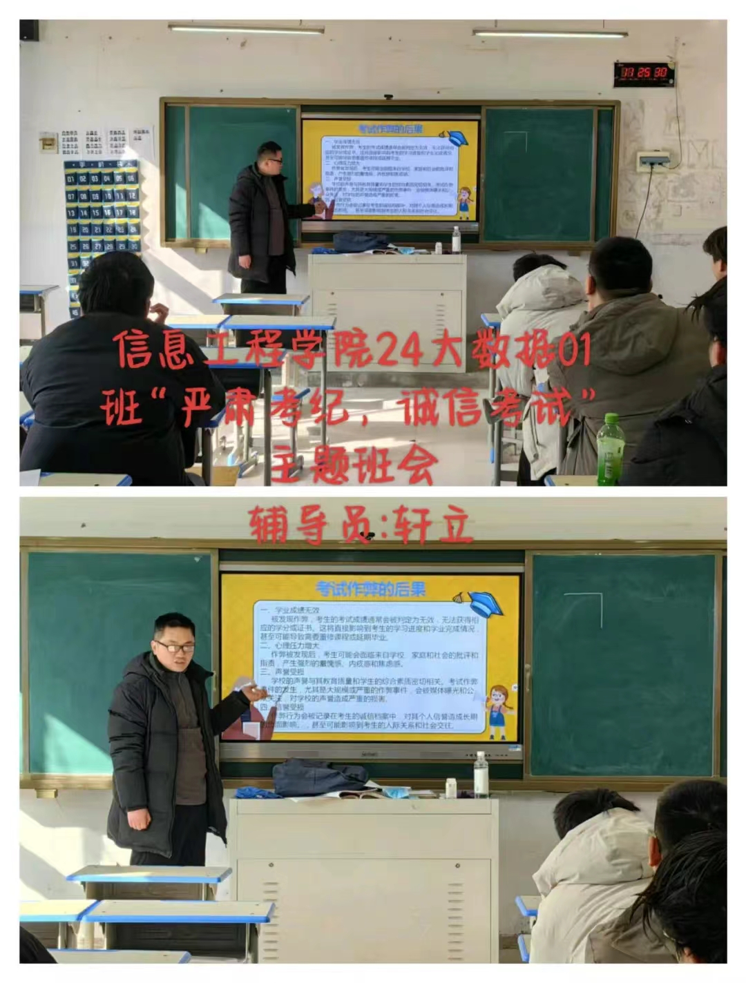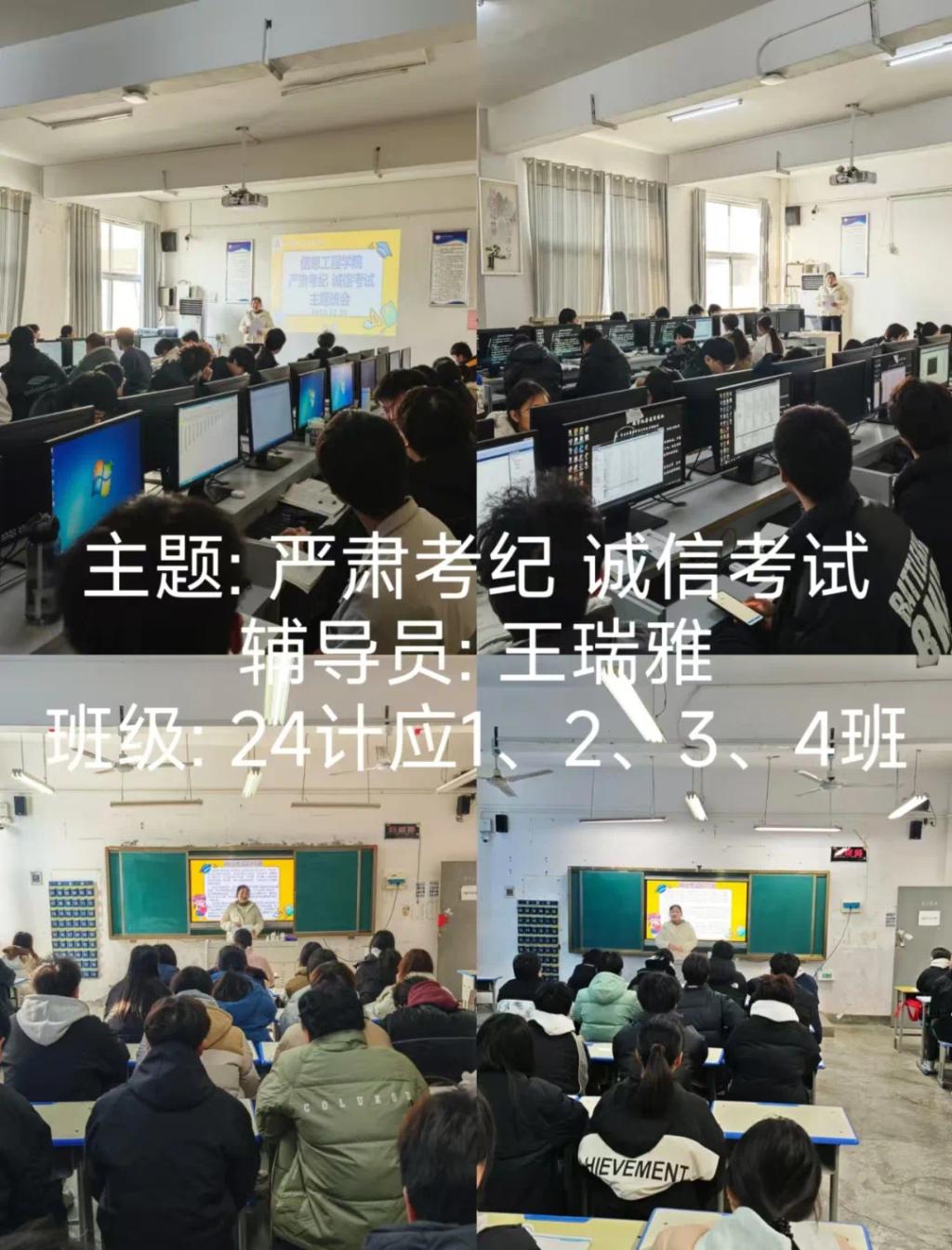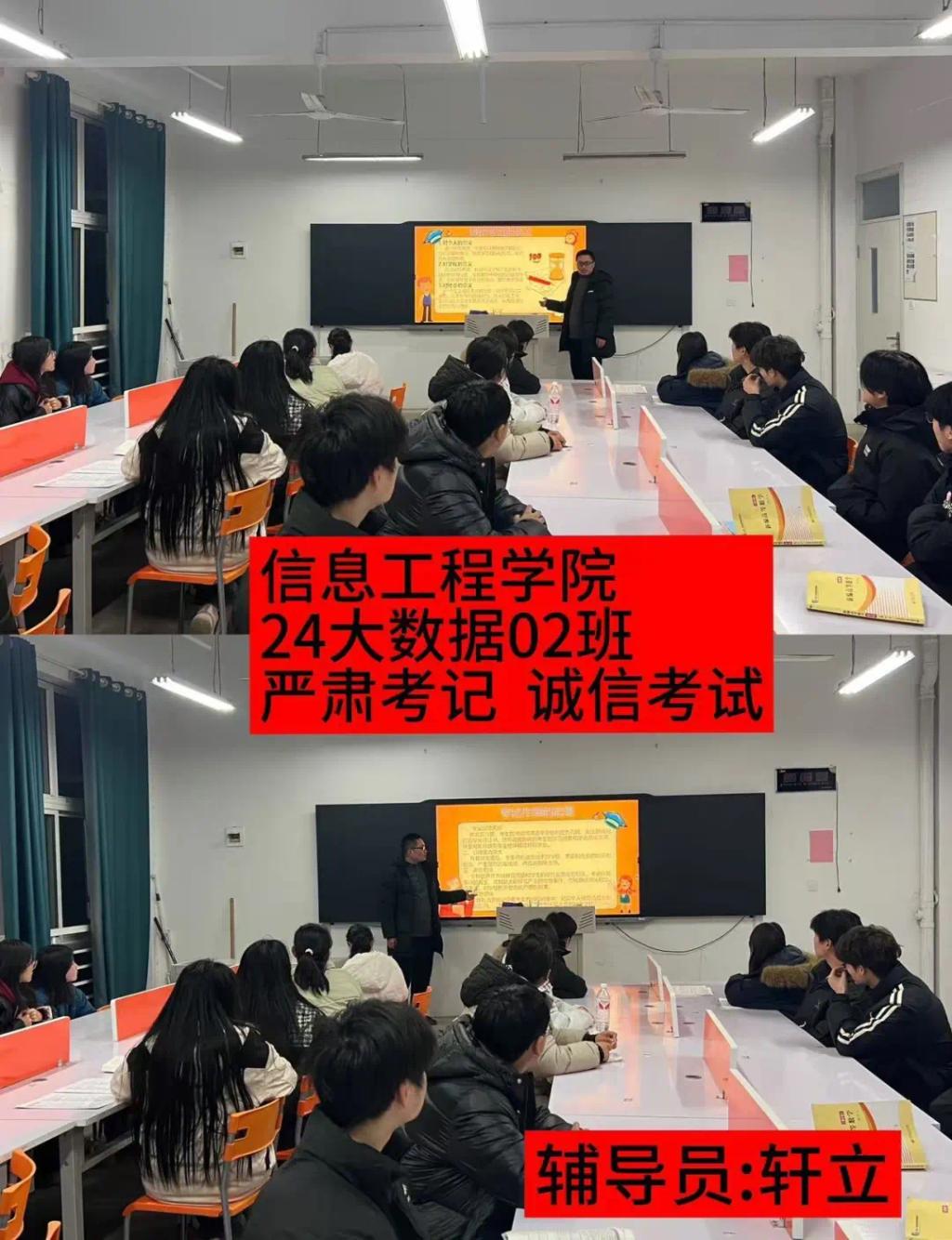 临近期末,信息工程学院各班辅导员陆续开展了以“严肃考纪,诚信考试”为主题的班会。本次班会旨在强化学生的诚信意识,营造公平公正的考试环境,确保每一位同学都能在良好的氛围中完成学业考核。