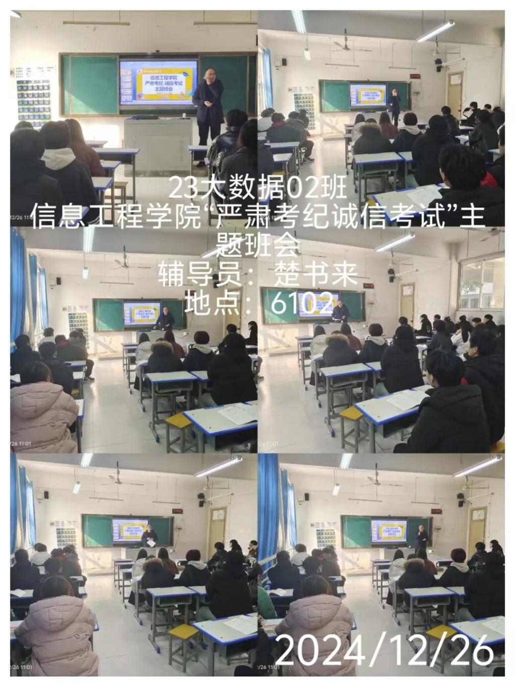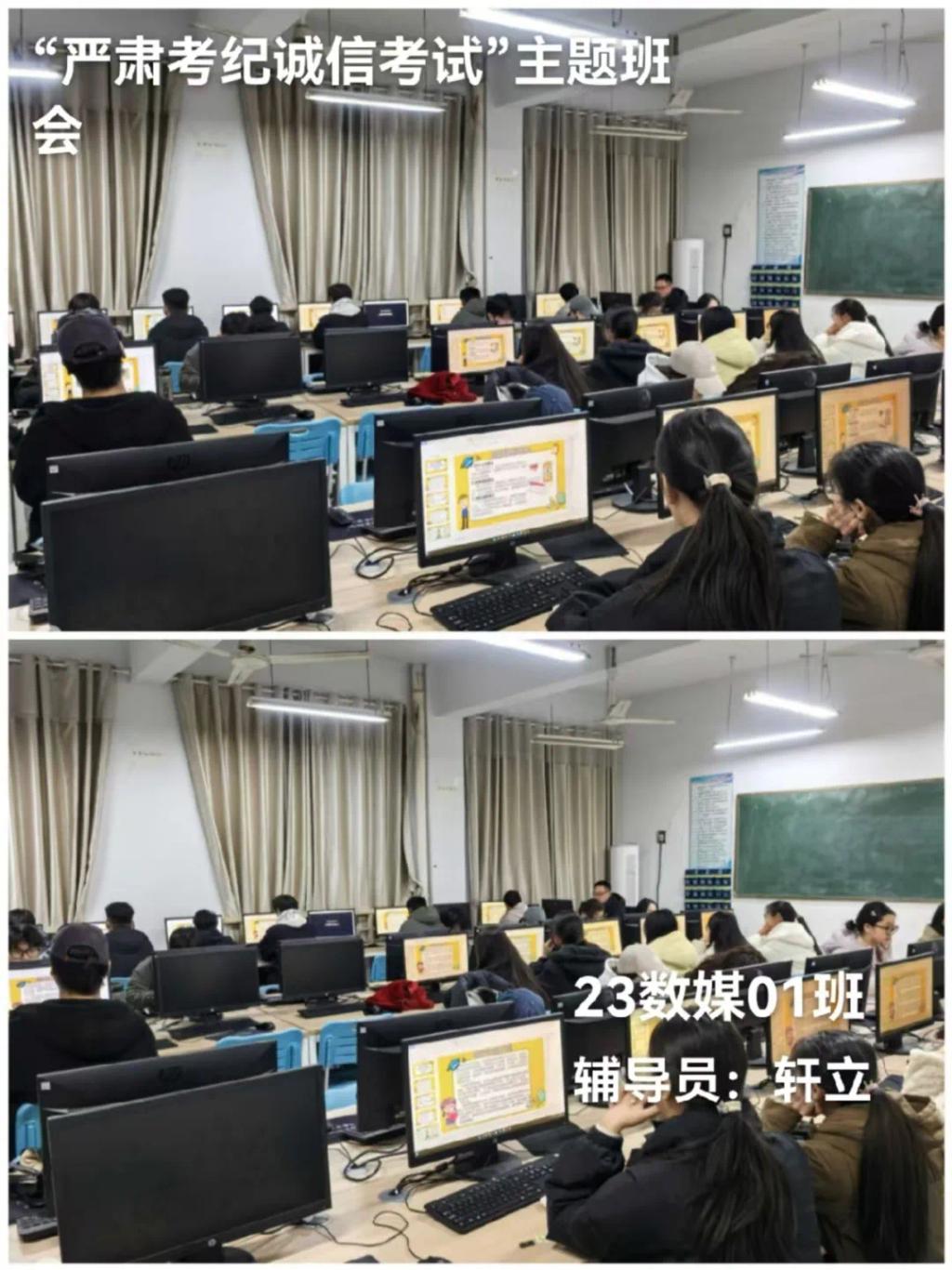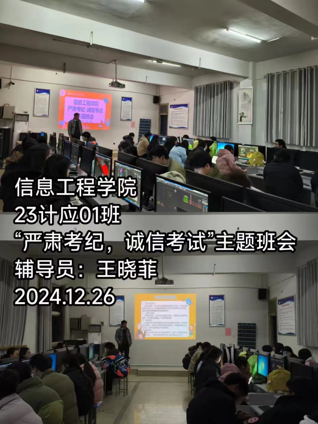 临近期末,信息工程学院各班辅导员陆续开展了以“严肃考纪,诚信考试”为主题的班会。本次班会旨在强化学生的诚信意识,营造公平公正的考试环境,确保每一位同学都能在良好的氛围中完成学业考核。