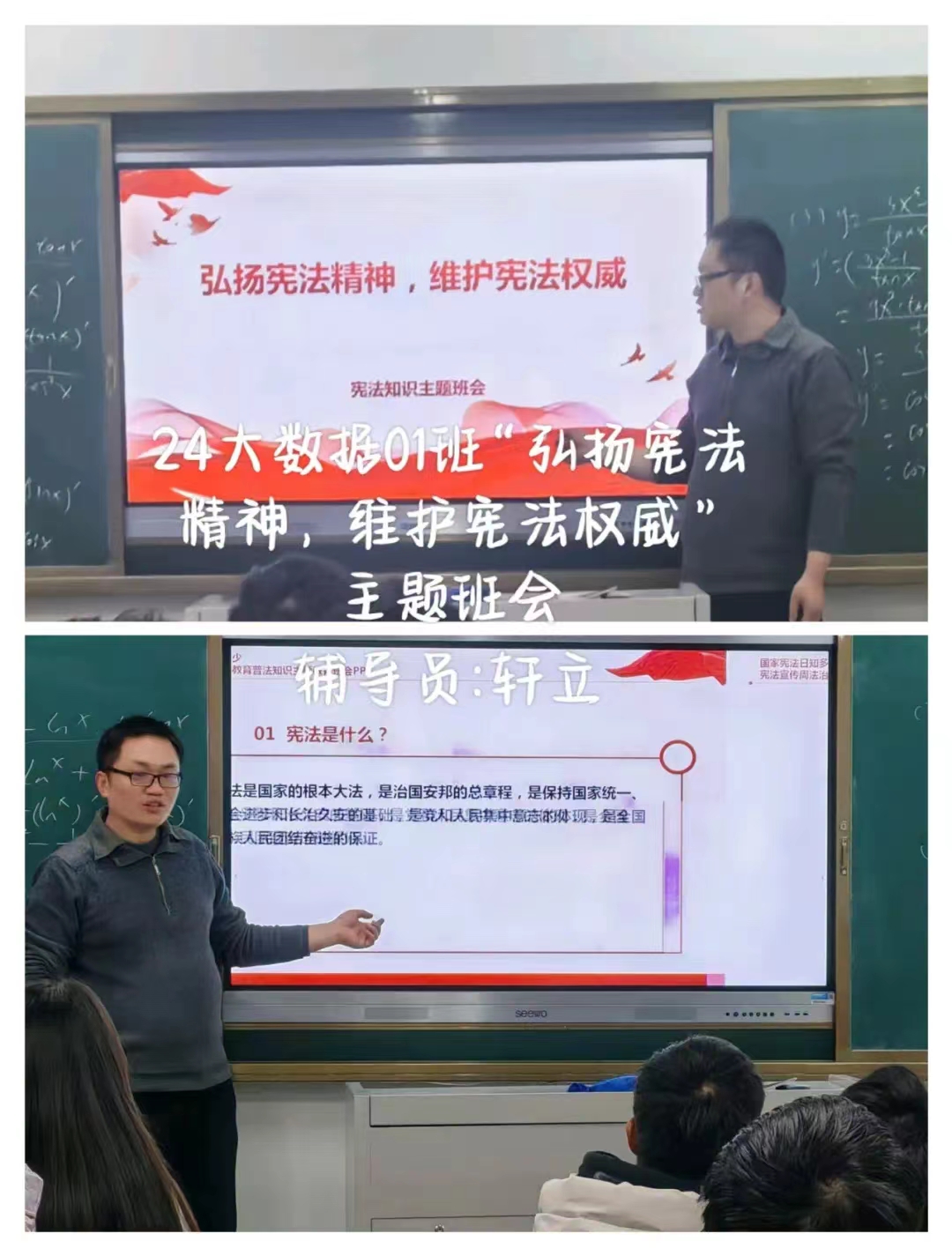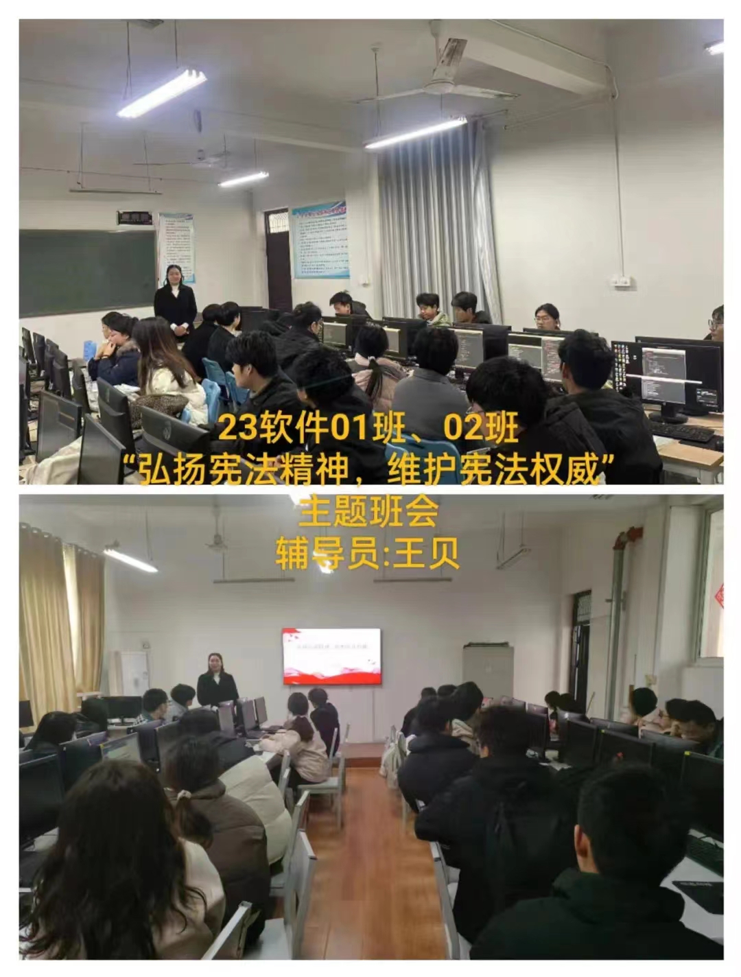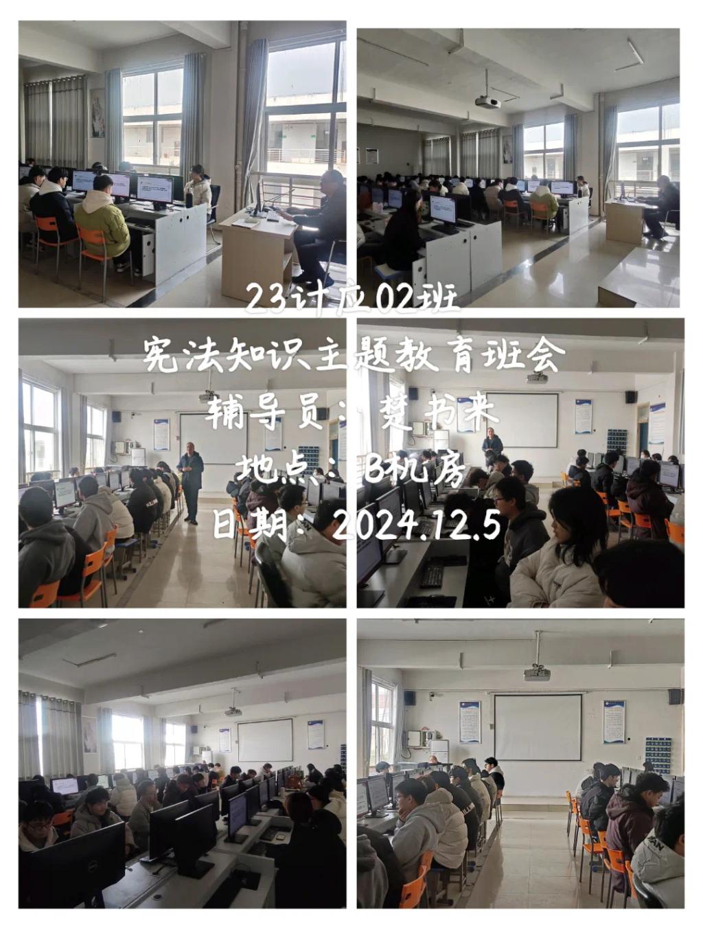 在开展班会中,各个班级的辅导员带领同学们共同学习了宪法知识,深入了解宪法的历史、基本原则以及公民的基本权利和义务等内容。通过生动的案例和通俗易懂的讲解,让同学们对宪法有了更加直观和深刻的理解。随后,还特别强调了宪法在日常生活中的作用和意义,引导同学们认识到宪法不仅是国家的根本大法,更是保护公民权利的重要法律武器。整场班会让同学们深刻体会到宪法就在我们身边,它是社会稳定和谐的基础,也是每个人幸福生活的守护者。
