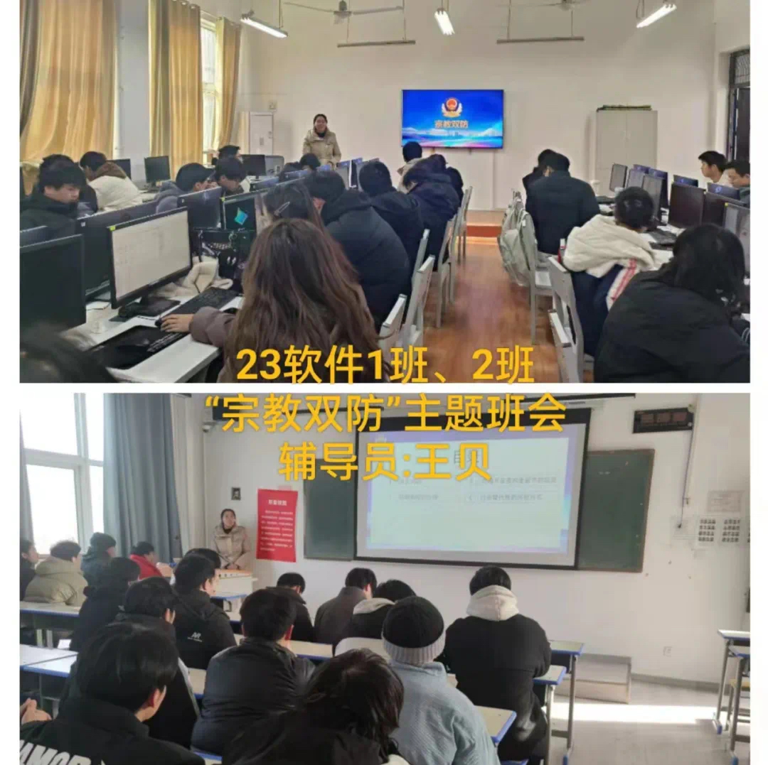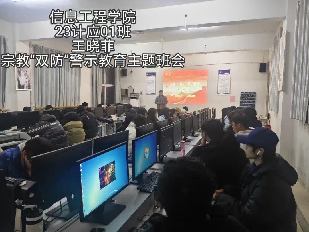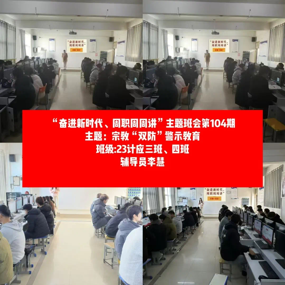 为了帮助同学们充分认识到非法宗教活动的危害,防范和抵御非法宗教势力向校园渗透,全面正确贯彻落实党的宗教政策,引导青年学生自觉抵制宗教渗透及传播。信息工程学院开展“奋进新时代,周职周周讲”第六十九期----民族宗教政策法规宣传教育主题班会。