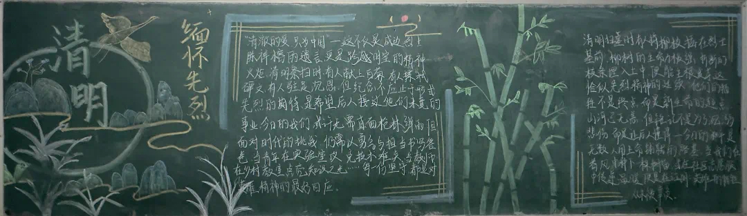 自活动通知发布以来,各班级高度重视,迅速组织并积极筹备。同学们热情高涨,全身心投入到黑板报的策划与创作之中。团队内部分工明确,有的同学负责资料收集,确保内容详实;有的同学精心构思设计,力求创意无限;还有的同学挥笔绘画,将对革命先烈的敬仰与追思融入每一个板块和图案之中。使黑板报都成为了一次心灵的寄托和对先烈精神的传承。主题鲜明,内容丰富多样,不仅生动描绘了革命先烈的英勇事迹,也深刻阐释了红色精神的内涵。这样的创作不仅是对历史的一次回顾,更是对未来的一种期许,激发起同学们心中对于英雄的崇敬之情以及继承和发扬革命传统的责任感。