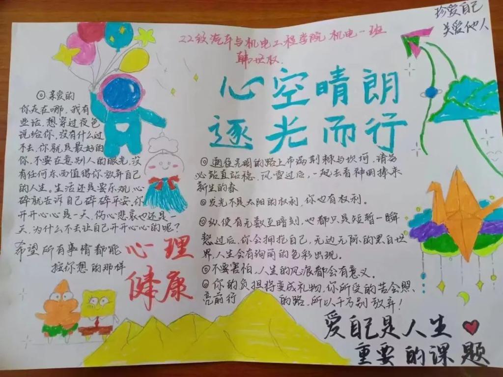 为进一步提高大学生的心理素质,促进大学生的身心健康和谐,宣传普及心理健康知识,推进校园心理文化的建设。我院于2023年3月30日,在各班开展了一场“心理健康”主题的黑板报、手抄报比赛活动。