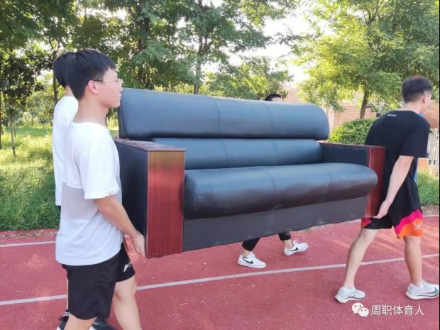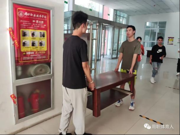 在整理过程中,21级体育教育二班c组的学生们搬、抬、扛齐上阵,虽然天气炎热,工作量巨大,大家并没有喊累,而是互相加油,默契配合。
