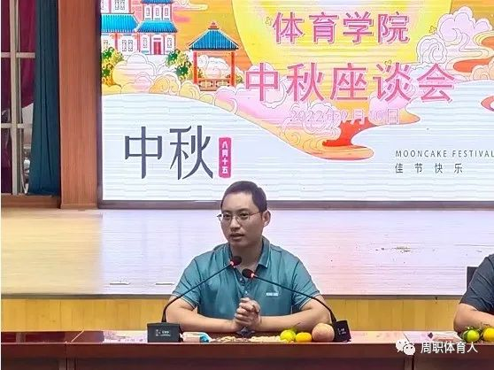 9月10日晚,体育学院举行“体育学院中秋节茶话会”,这是体教21级学子们在校度过的第一个中秋佳节。参加此次活动的有体育学院党总支书记王晖、体育学院院长徐长宇、体育学院院长李海磊、体育学院(公体一)教研室主任史帅、体育学院各班辅导员赵杰夫、王保泰、冯冠博及全体21级学子,本次活动由21级学子赵锟靖主持。