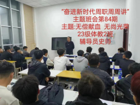 22级体教一班辅导员主要围绕无偿献血的相关知识展开,包括血液知识、献血的条件和标准、献血前后的注意事项以本校献血地点的介绍等,在为献血普及知识的同时,宣扬了“互相帮助、助人自助、无私奉献、不求回报”的志愿者精神。主题班会的宣讲内容十分激动人心,不少同学受此激励,积极参与到无偿献血的队伍中去。