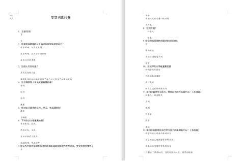 大学生是国家宝贵的人才资源,民族的希望,祖国的未来,随着市场经济体制的确立和高校改革的不断深化,高校大学生思想发生了比较深刻的变化,学校充分认识到加强和改进在校学生思想教育工作的重要性,现决定在我院范围内开展大学生思想动态调研工作,以此来了解我院在校学生的思想动态。为了及时掌握当代大学生的思想脉搏,现以问卷调查的形式了解大学生的思想动态。请认真填写,我们只做整体分析,不会泄露你的个人隐私。