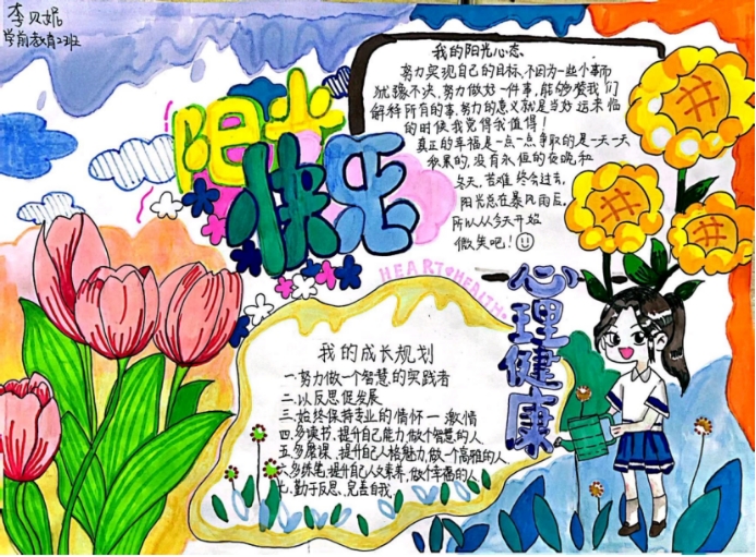 为了进一步宣传普及心理健康知识,促进学生身心健康发展,周职院五年制大专部组织策划了本次“奔向未来,从‘心’开始”主题心理健康手抄报评比活动。主题系列活动聚焦生命成长与心理关怀,旨在培育同学们自尊自信、理性平和、积极向上的健康心态,用“心”方式助力学生成才发展。