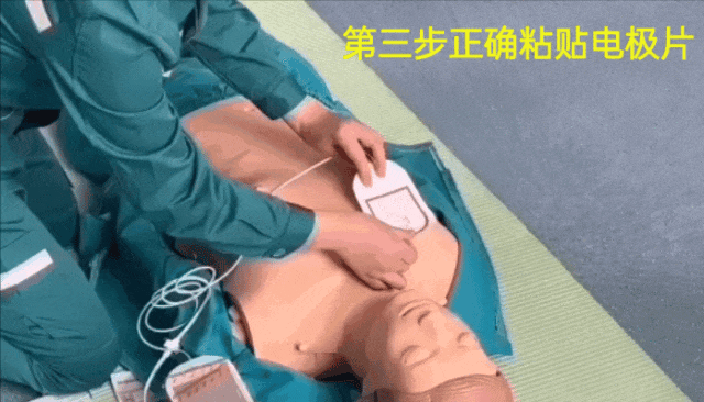 (2)把他的衣服解开,充分暴露胸部,迅速擦干胸部过多的水分或汗液,必要时清除过多的胸毛,确保电极片与皮肤贴合紧密。