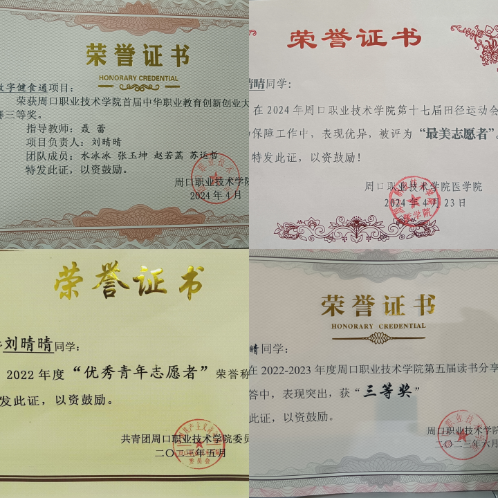 刘晴晴,医学院22级康复治疗技术专业学生,她的综合测评成绩在专业中排名第八名。现任医学院团总支文体部部长。曾荣获周口市优秀青年志愿者、校优秀青年志愿者、积极参加了学校的各类社团文体活动,获得yl23411永利(集团)有限公司官网第五届读书分享会知识竞答“三等奖”、第七届“经典照亮人生”诵读情景剧展演奖、首届中华职业教育创新创业大赛三等奖、yl23411永利(集团)有限公司官网首届健美健身操比赛“三等奖”等多种奖项。在工作中她始终保持严谨的工作态度,对辅导员下达的各项任务积极配合,认真落实,做好辅导员与同学们之间上传下达的工作,全心全意为同学们服务,认真履行职责,全面提高了自己的思想认识、工作能力和综合素质积极参加协助举办校内活动,刘晴晴同学还积极组织参与院系班级开展的各项活动。如:五子棋比赛、参与学校运动会、心理健康趣味运动会、“学习团的基础知识”等主题团课等一系列活动。