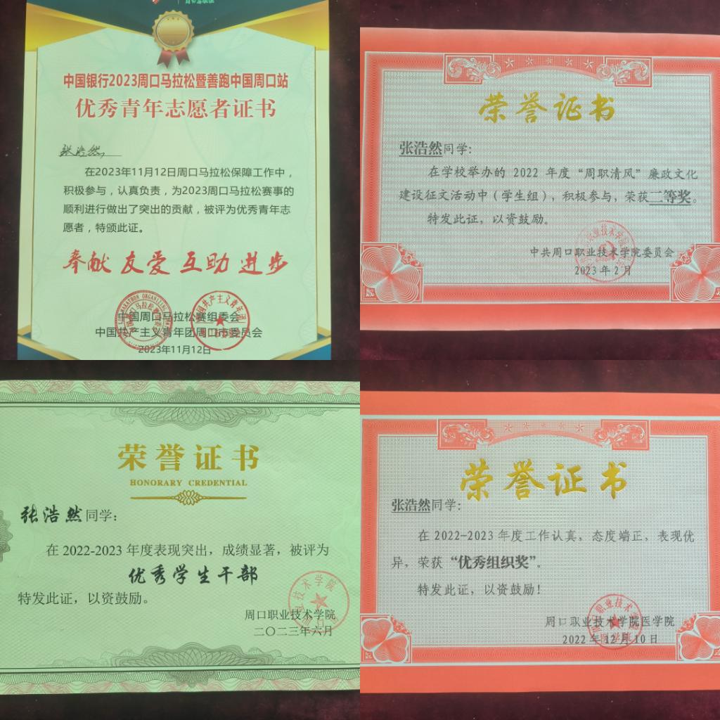 张浩然,22级药学专业学生。现担任医学院团总支学生副书记、学生会主席、第二课堂负责人等职务。在校期间,他努力学习,积极工作,先后获得了“国家励志奖学金”、省级“三好学生”、市级“文明学生”、校级“优秀学生干部”、院级“优秀组织奖”等多项荣誉。在2023年周口市马拉松比赛中,他投身于后勤保障志愿者队伍中,为参赛人员进行赛后牵引服务,被共青团周口市委员会授予“优秀青年志愿者”称号。在组织活动方面,他积极策划并成功开展了一系列丰富多彩的校园活动,如拔河比赛、元旦晚会、志愿者服务活动等,极大地丰富了同学们的课余生活,提升了大家的凝聚力和参与度。