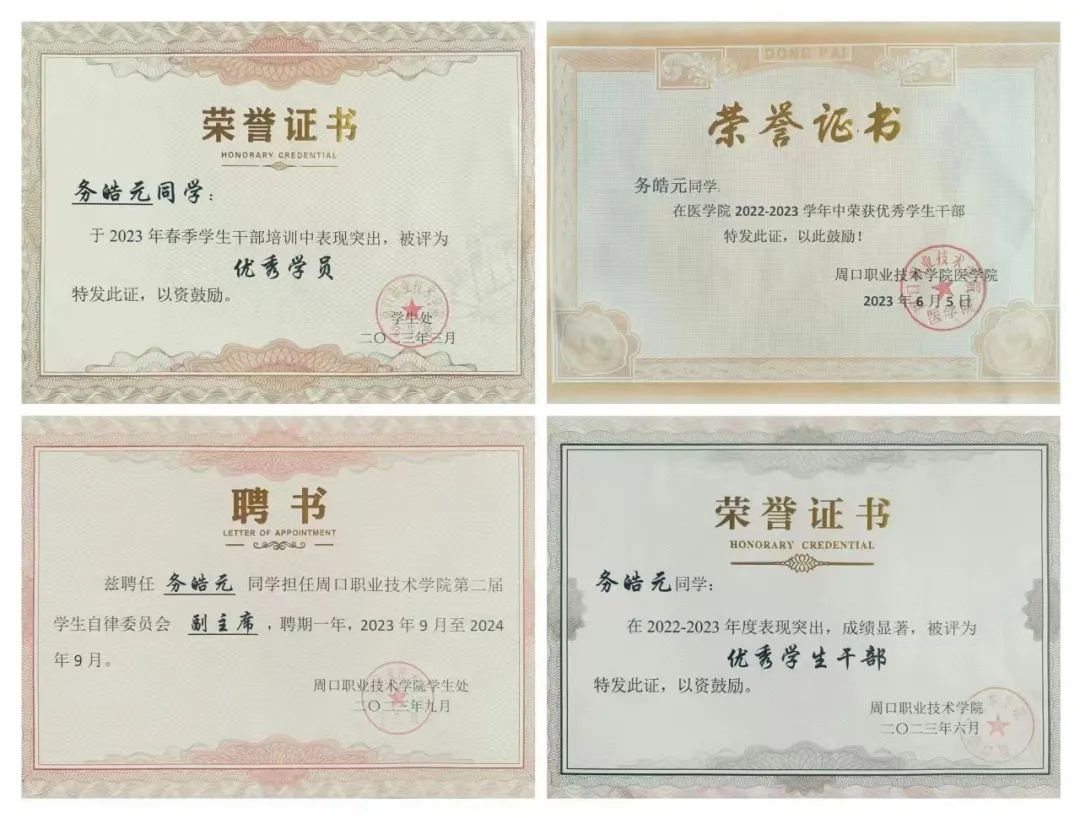 务皓元,22级康复治疗技术专业学生,现担任学生自律委员会主席,学习优秀,获得校内奖学金,省级文明学生,省级优秀学生干部。校级“优秀学生干部”“文明学生”的称号。他积极的组织和参与校园内的各项活动,表现出了良好的组织能力和团队精神。并且在迎新活动和运动会中荣获“优秀志愿者”,他的经历不仅丰富了他的日常生活,同时也加强了他的责任感和奉献精神。