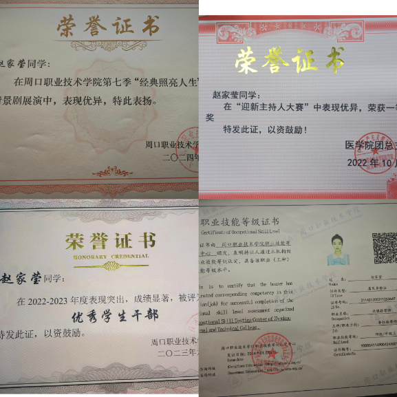 赵家莹,22级医学影像技术专业学生。现文昌校区广播站站长一职。她的综合测评成绩在班级位于前列,在校期间积极参与学校组织的各项活动和比赛,在医学院迎新主持人大赛中荣获一等奖,校级“优秀学生干部”,参加第十七届田径运动会后勤保障工作,积极为同学服务,被评为“最美志愿者”称号,在第七届经典诵读比赛中表现优异,参与主持yl23411永利(集团)有限公司官网医学院2022年迎新晚会、yl23411永利(集团)有限公司官网医学院校园十佳歌手大赛、医学院2023年迎新晚会、yl23411永利(集团)有限公司官网文昌校区2024年元旦晚会、yl23411永利(集团)有限公司官网医学院读书分享会等。这些丰富的校园活动充实着她的大学生活,更让她的各方面的能力得到锻炼。