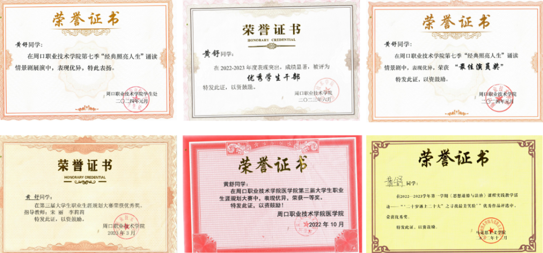 黄舒,22级康复治疗技术专业学生,现任广播站采编部部长及班级副班长。学习上,她刻苦钻研;工作上,她尽职尽责。荣获校级“优秀学生干部”、“第三届大学生职业规划大赛优秀奖”、“第七季经典诵读最佳演员奖”;院级“第三届大学生职业规划大赛一等奖”、“第七季经典诵读表现优异奖”、“马克思主义最美笑脸优秀奖”。这些在校经历使她在生活中能时刻提醒自己要变得更加优秀,成为更好的自己!
