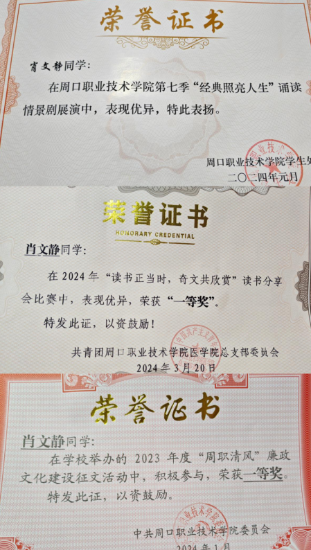 肖文静,23级医学影像技术专业学生,综合测评成绩在班级位于前列。在校期间,她参与了学校多项比赛,在2023年度“周职清风”廉政文化建设征文活动中荣获一等奖,在"读书正当时,奇文共欣赏”读书分享会比赛中荣获一等奖,在yl23411永利(集团)有限公司官网第七季“经典照亮人生”诵读情景剧展演中获荣誉证书,在学院第一届英语话剧比赛中获团体三等奖。她不仅在课堂上表现出色,还积极参与社会实践活动,她与团队所参与的2024年“挑战杯”中国大学生创业计划竞赛项目入选省赛,这些经历不仅丰富了她的大学生活,也提升了她的社会责任感,也体现了她自强不息的优秀品质。