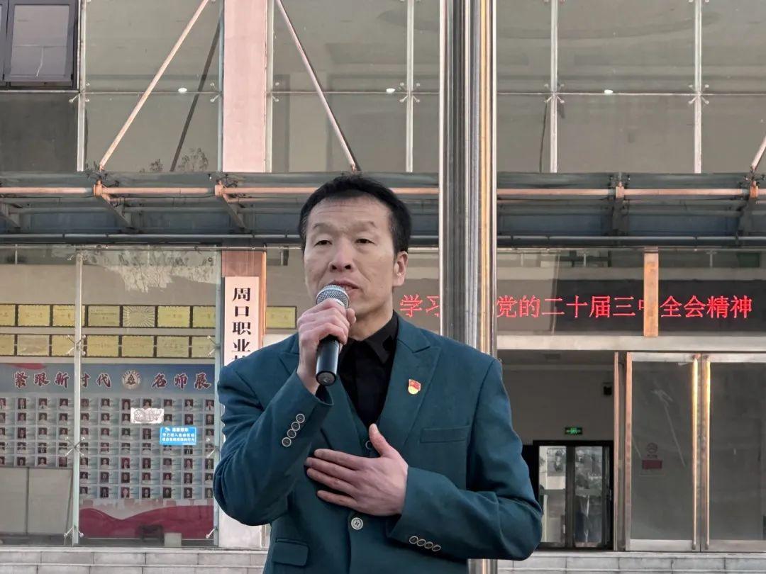 最后王春生带领全体师生面向国旗,庄严宣誓:“请党放心,强国有我,全场用最洪亮的声音坚定地向祖国许下了誓言与承诺。