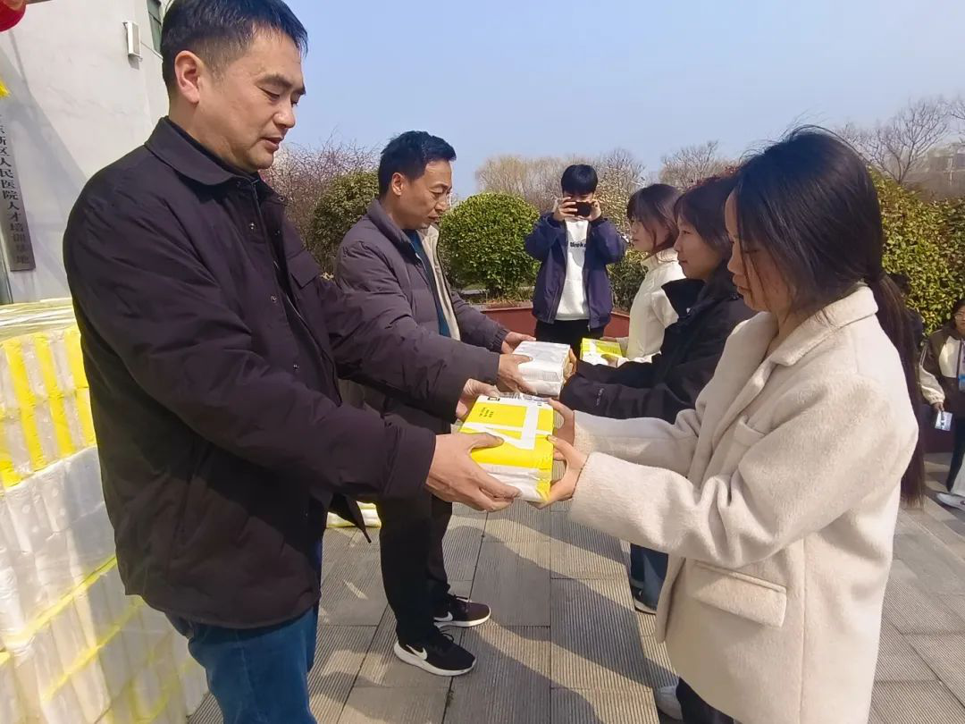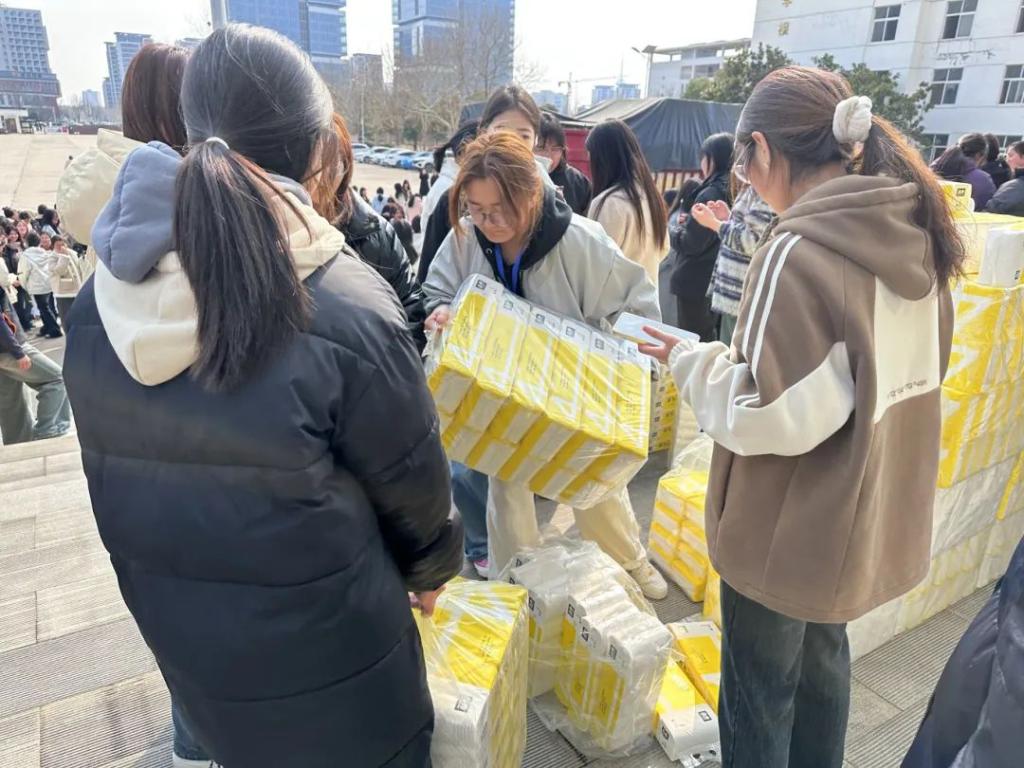 活动现场,医学院党总支书记苑建伟,副院长王向华早早来到场地,身旁堆满为女同学们准备的卫生纸,他们脸上洋溢着关怀的神情,亲自拿起一提提卫生纸,递到每位同学的手中并送上温暖的节日祝福,同学们满心欢喜地接过卫生纸,脸上洋溢出灿烂的笑容。