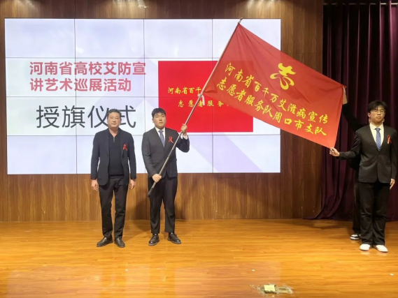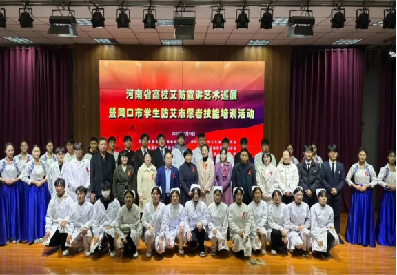 为进一步提高青年学生艾滋病知识知晓率,引导青年学生养成健康文明的生活方式,2023年11月15日,河南省2023年高校艾防宣讲艺术巡展暨周口市学生防艾志愿者技能培训活动在yl23411永利(集团)有限公司官网文昌校区成功举办,yl23411永利(集团)有限公司官网副校长于爱霞,周口市疾控中心艾防科长张林,周口市疾控中心艾防二科科长姚明春,周口市青春健康教育师资、市防艾骨干志愿者梁紫棋老师,周口市艾滋病防治专家张焕老师以及护理学院、医学院相关领导出席本次活动,我院100余名防艾志愿者参加,由yl23411永利(集团)有限公司官网学生处处长刘冬霞主持。