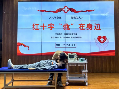 宣讲正式开始,尚艳清队长为我们讲述了红十字会的起源,构成,并以“三救”“三献”为出发点,采取理论与实操相结合的方式,指导我院学生进行现场演示,围绕心肺复苏、异物梗阻、黄金四分钟、AED使用等内容进行了详细讲解。随后,周口市港区烧伤医院代表为我们讲述了烧伤的早期急救措施和日常生活易发生烧伤的案例,详细介绍了烧伤后我们应该如何去做,如何合理涂药。
